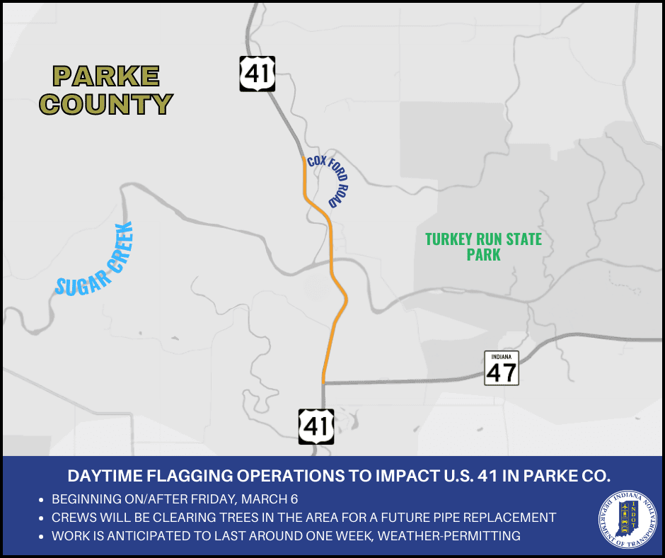 The Indiana Department of Transportation (INDOT) will begin daytime flagging operations on U.S. 41 near Turkey Run State Park tomorrow. According to their release, the project involves clearing trees for a future pipe replacement this summer. Work is expected to take one week contingent on weather conditions. A map provided by INDOT can be viewed below.