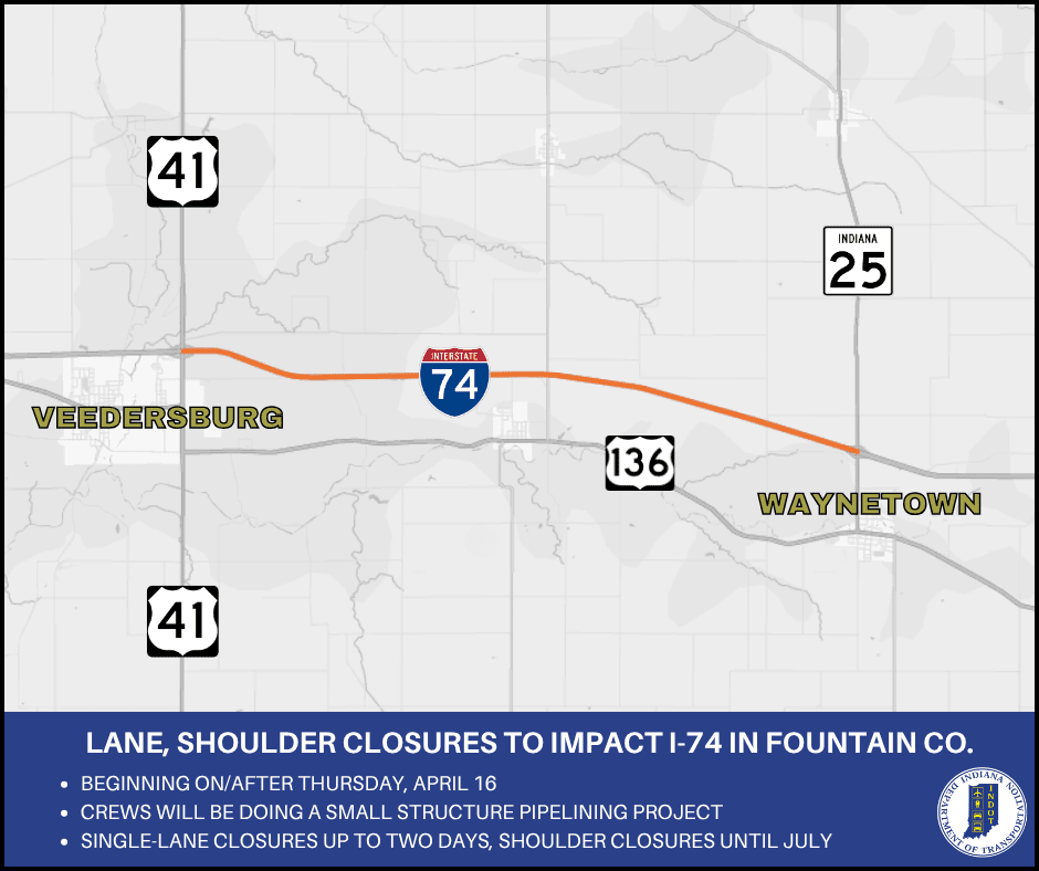 The Indiana Department of Transportation (INDOT) announced in a press release its intent to implement lane and shoulder closures on Interstate 74 between Waynetown and Veedersburg. The work is expected to begin on or after Thursday, April 16, with the right lanes going in each direction closing for up to two days. Lane shoulder closures will follow afterwards and is expected to last until July, weather permitting.